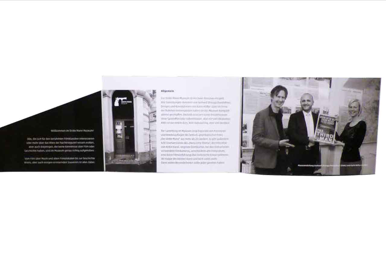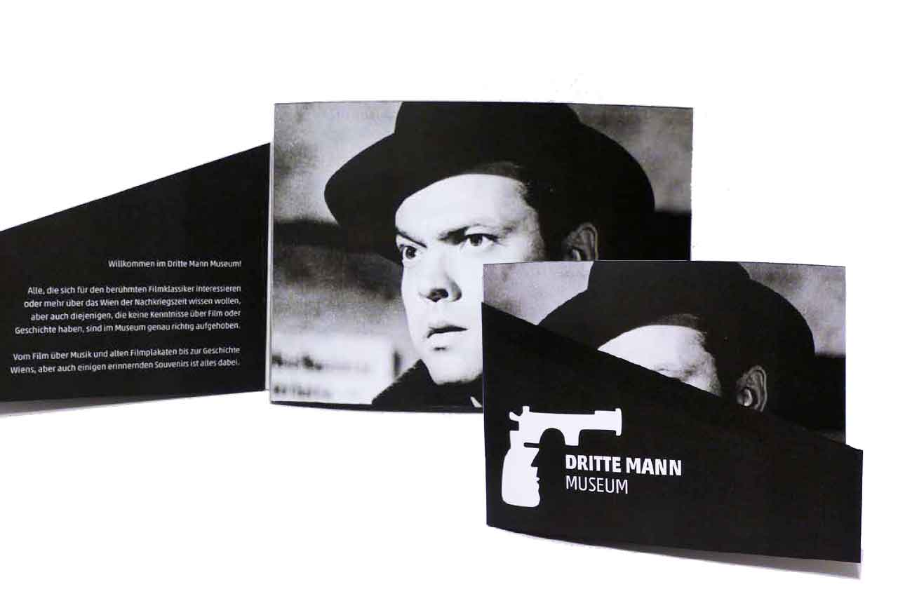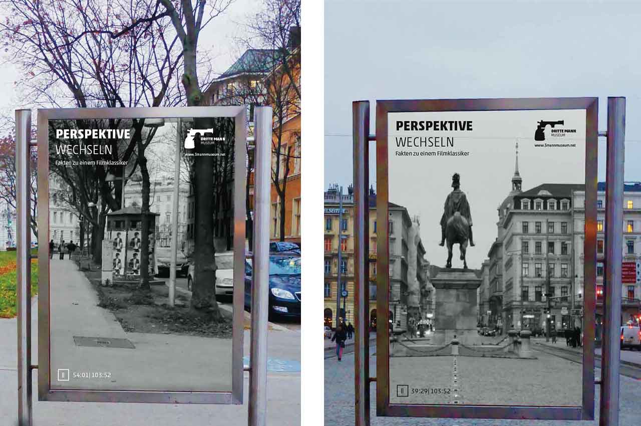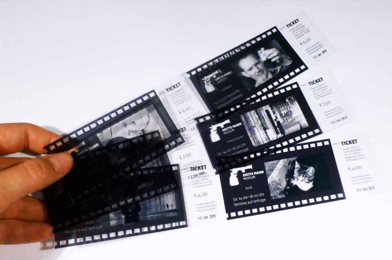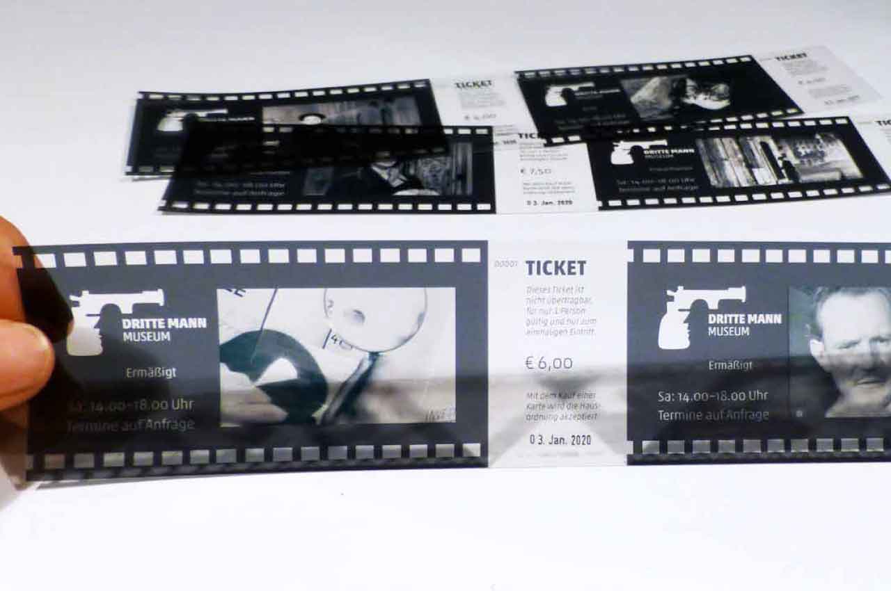 Ich habe im Design und Logo die klassischen Elemente des Films “Der Dritte Mann”, ein in Schwarzweiß gedrehter britischer Thriller aus dem Jahr 1949, einfließen lassen. Alles ist in Schwarz-Weiß gehalten, Vertikale Betonung und Schräge, die Eintrittskarten sollen in ihrer visuellen Erscheinungan eine Filmrolle errinnern. Die Plakate werden nahe der Originaldrehorte montiert.