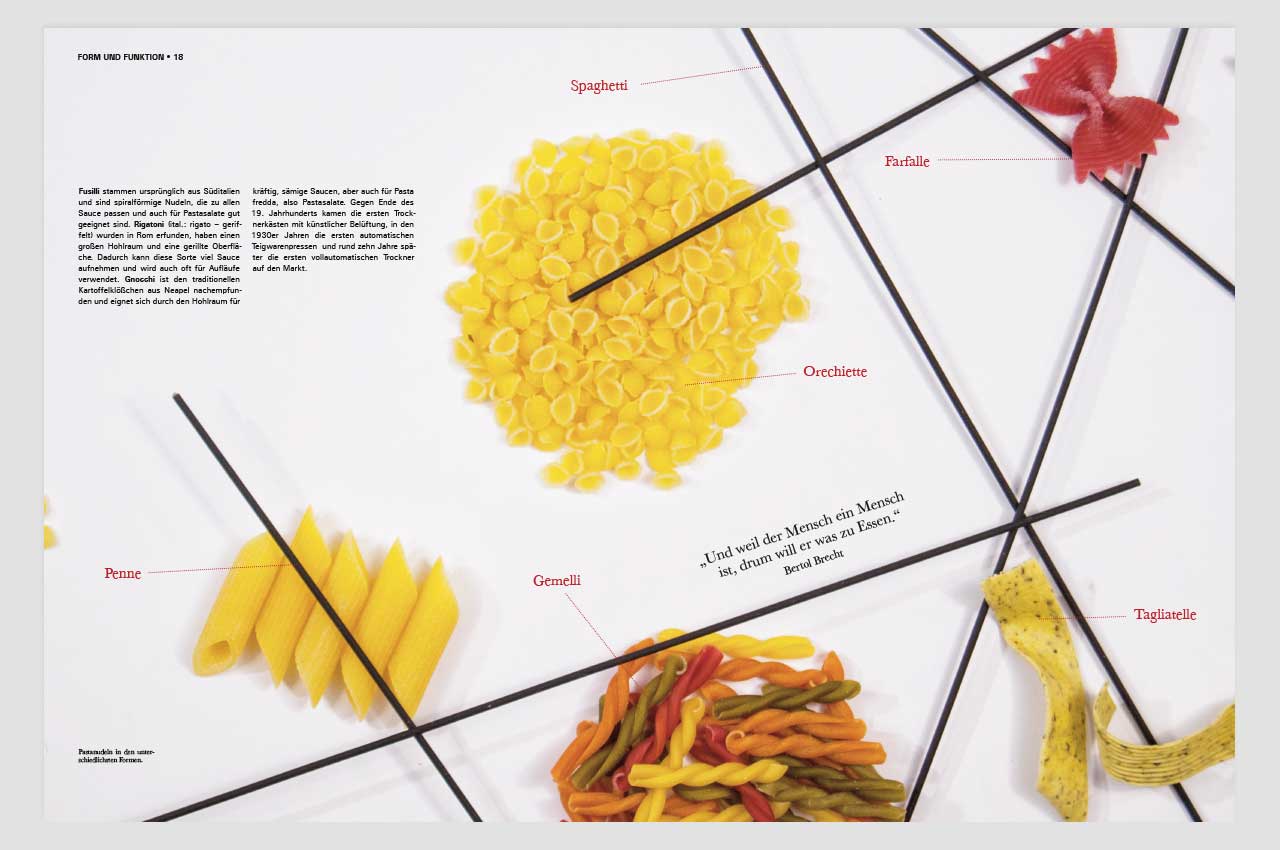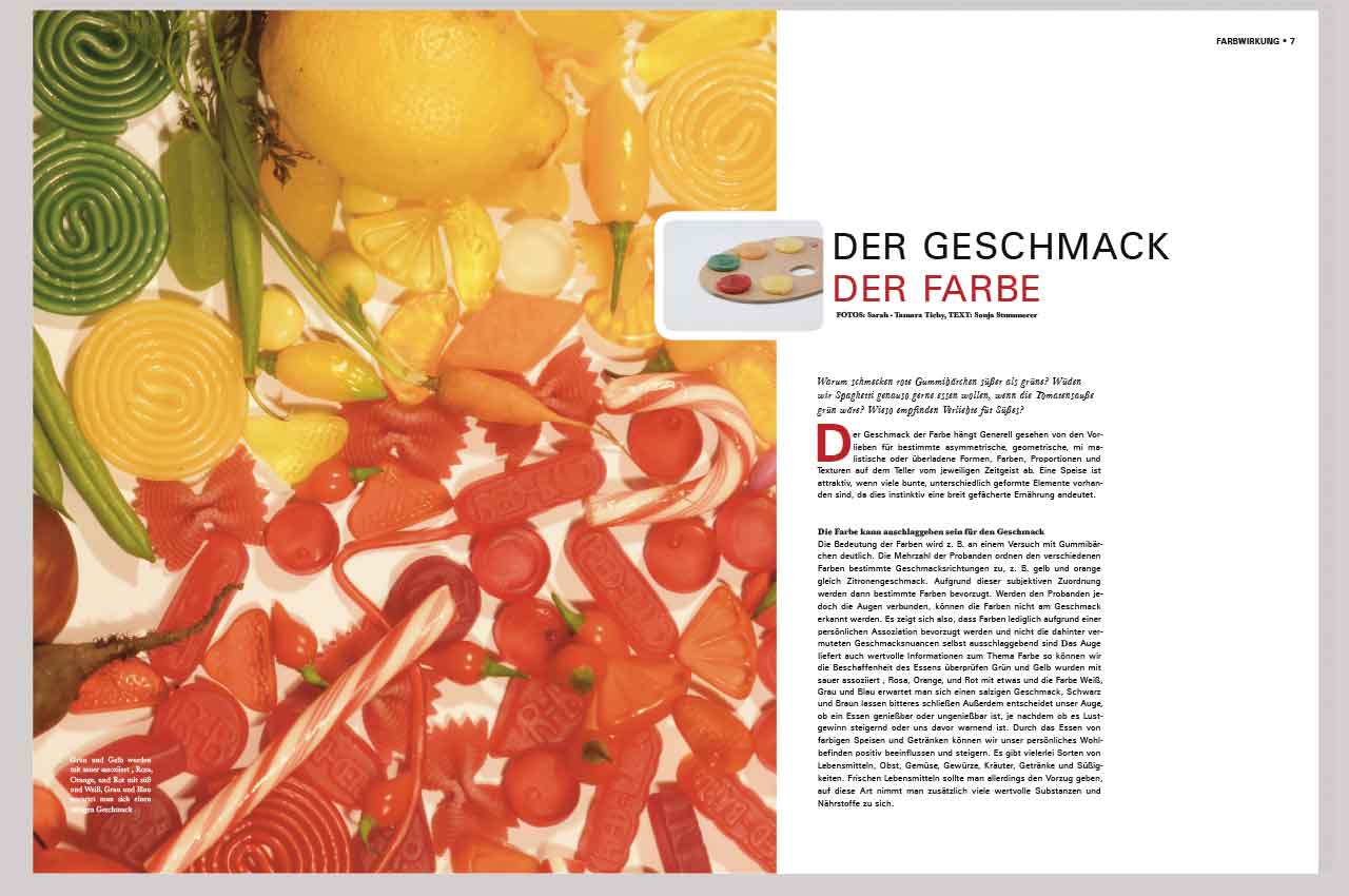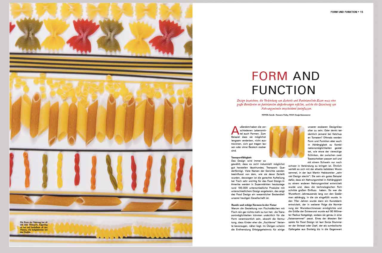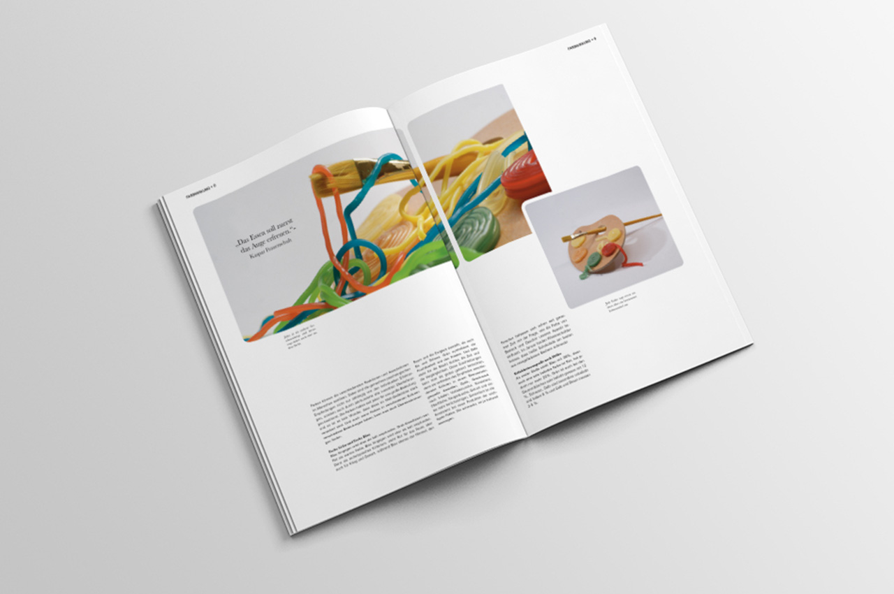 Zum Thema Food Design entstand dieses Magazin mit selbst gemachten Fotografien. Es beschäftigt sich mit der Fragestellung “Was ist Food Design und Food Styling?” Die einzelnen Kapiteln beeinhalten Themen, wie Farbe, Form und Konsistenz.