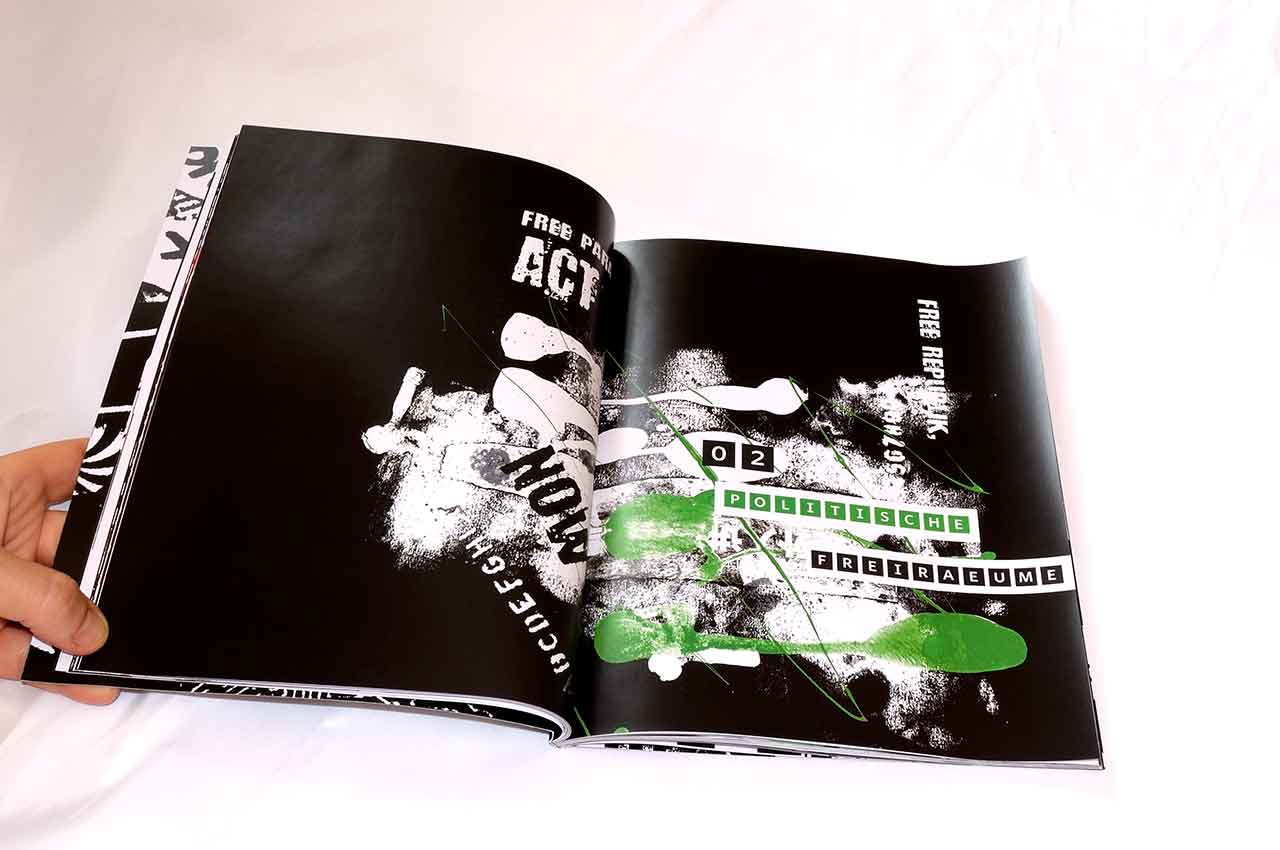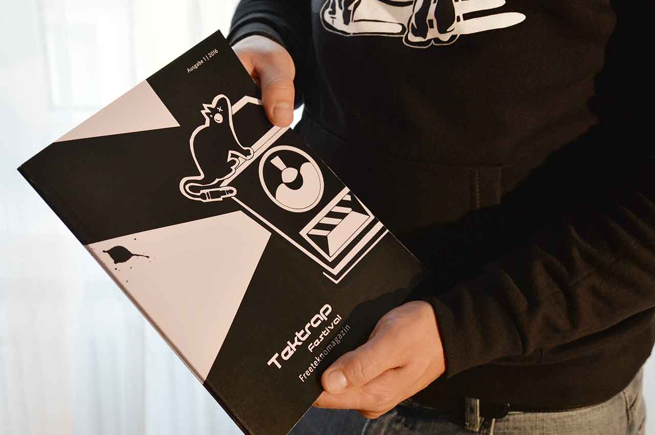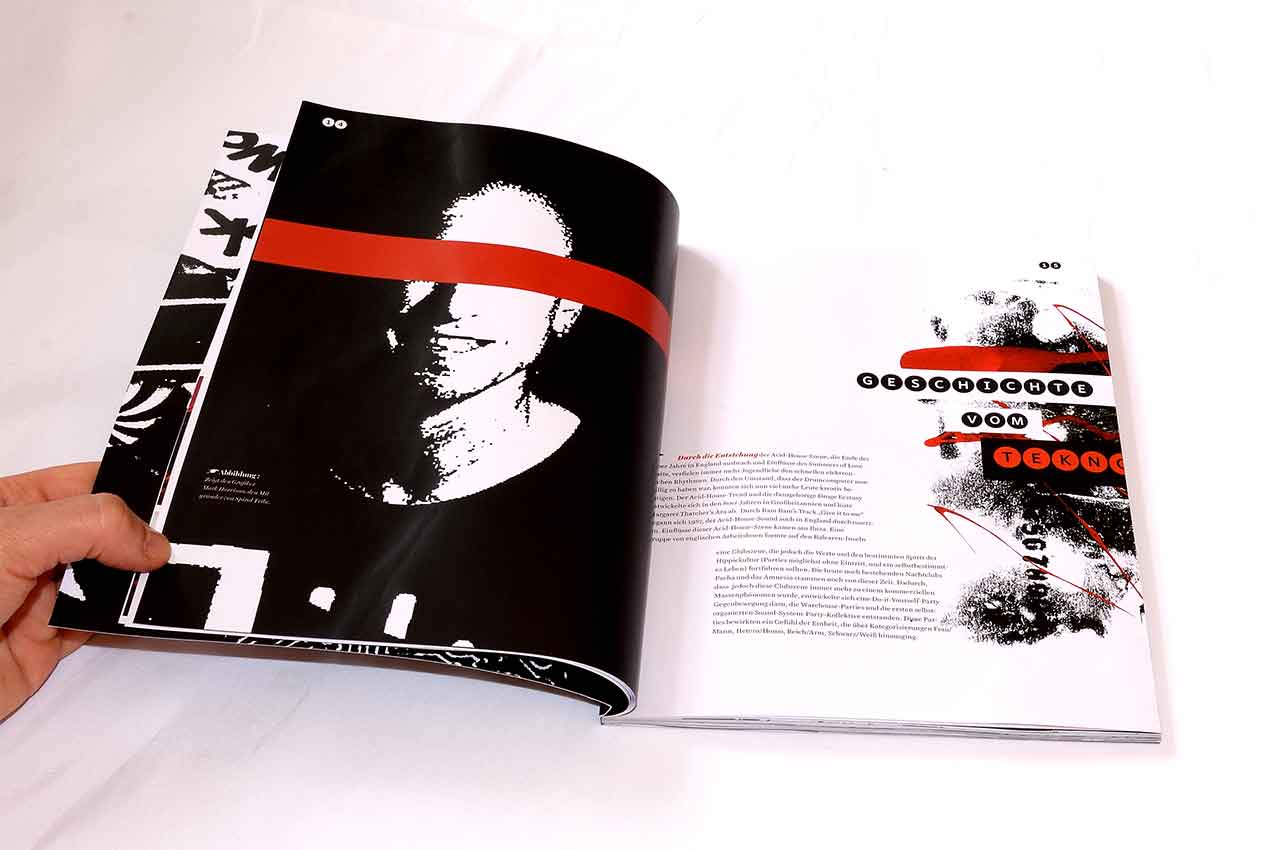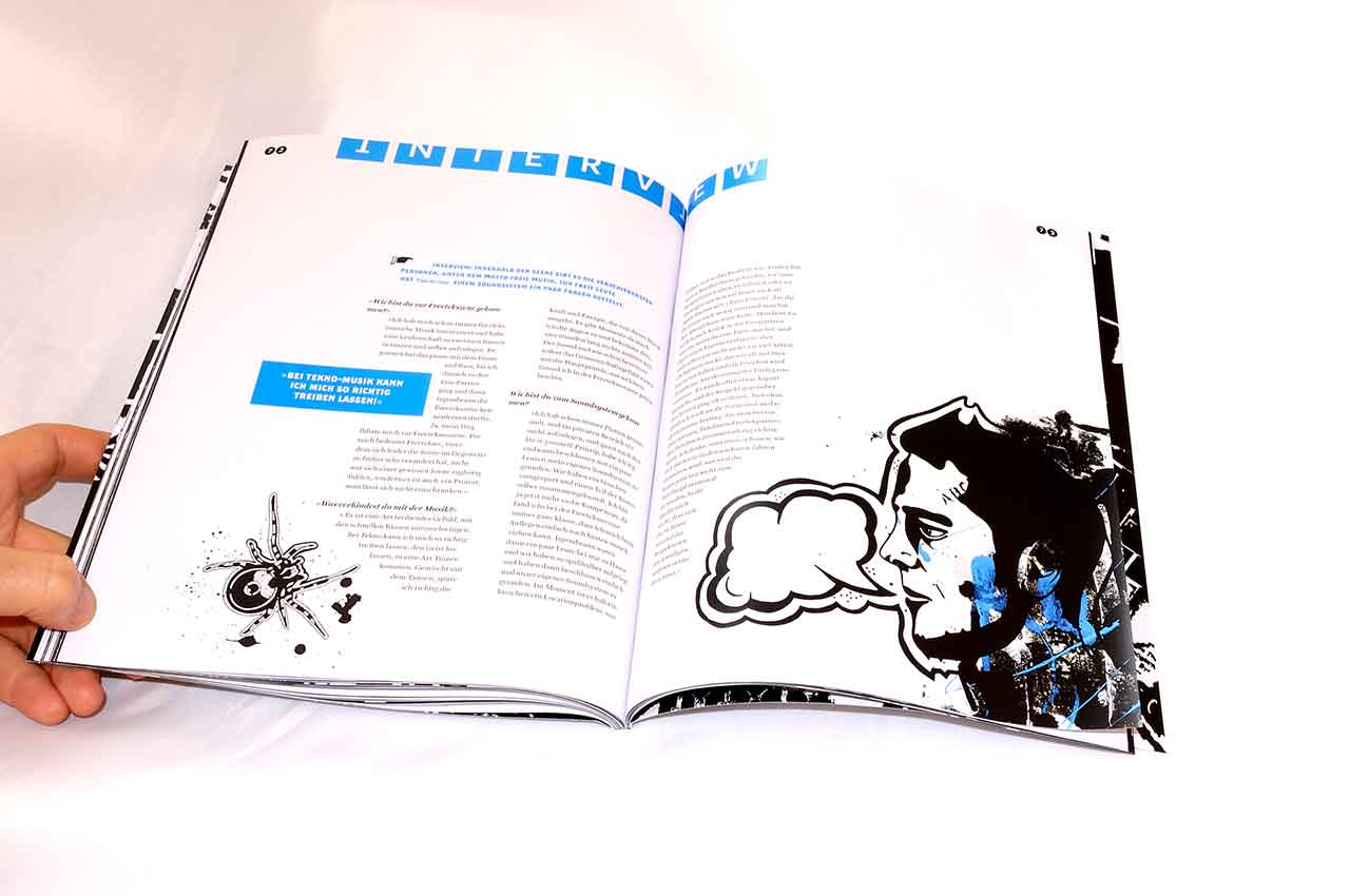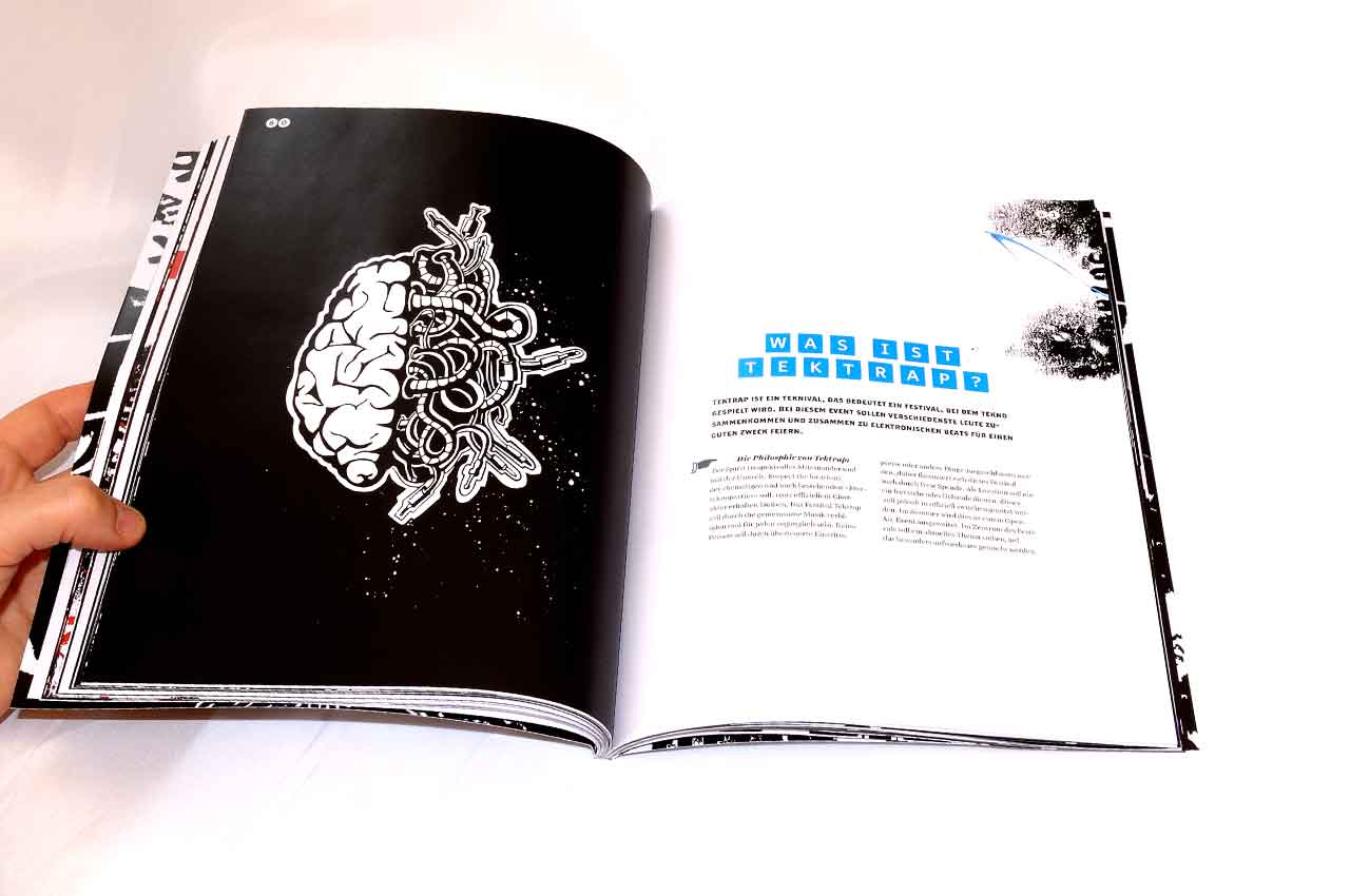 Für ein fiktives Tekno-Festival habe ich ein Logo und Festivalmagazin, Flyer, Sticker und Pullover kreiiert . Das Magazin besteht aus handgezeichneten lllustrationen, selbst gemachten Fotos und geführten Interviews mit Soundsystemen. Man erfährt zudem etwas über die Hintergrundschichte des Teknos.