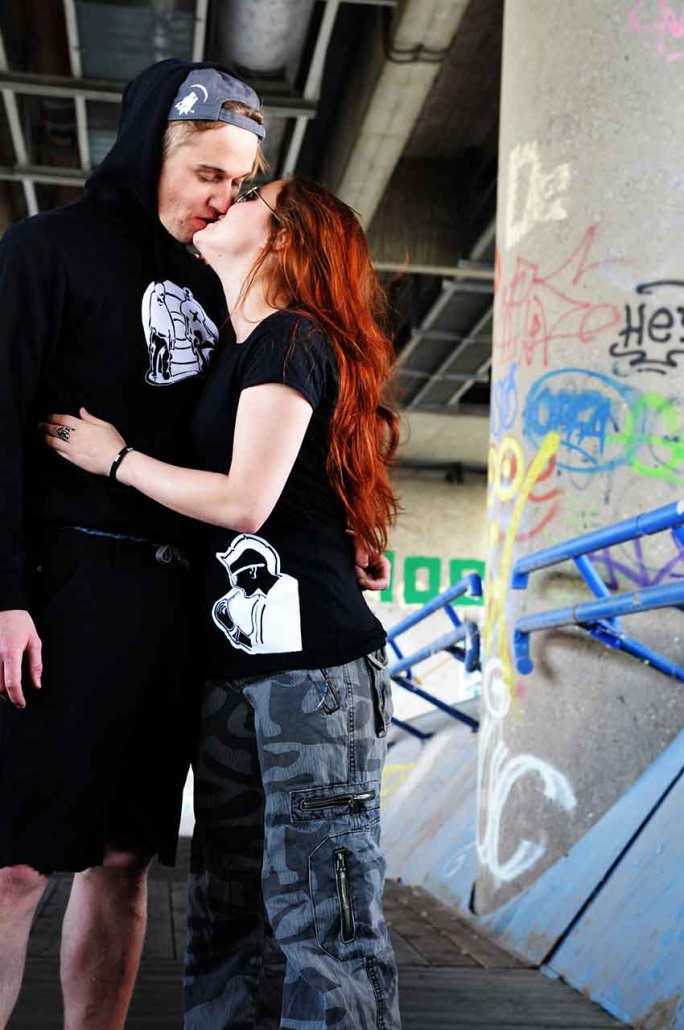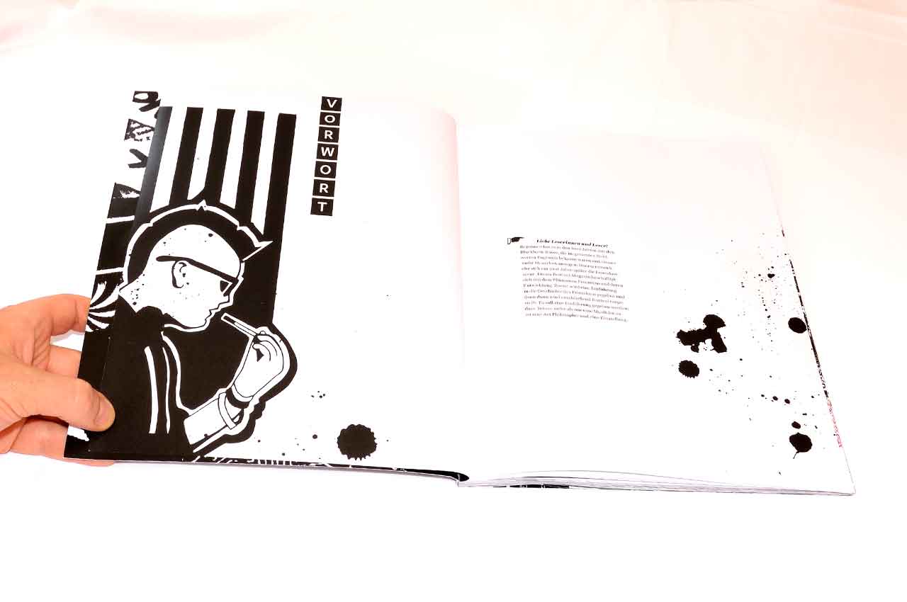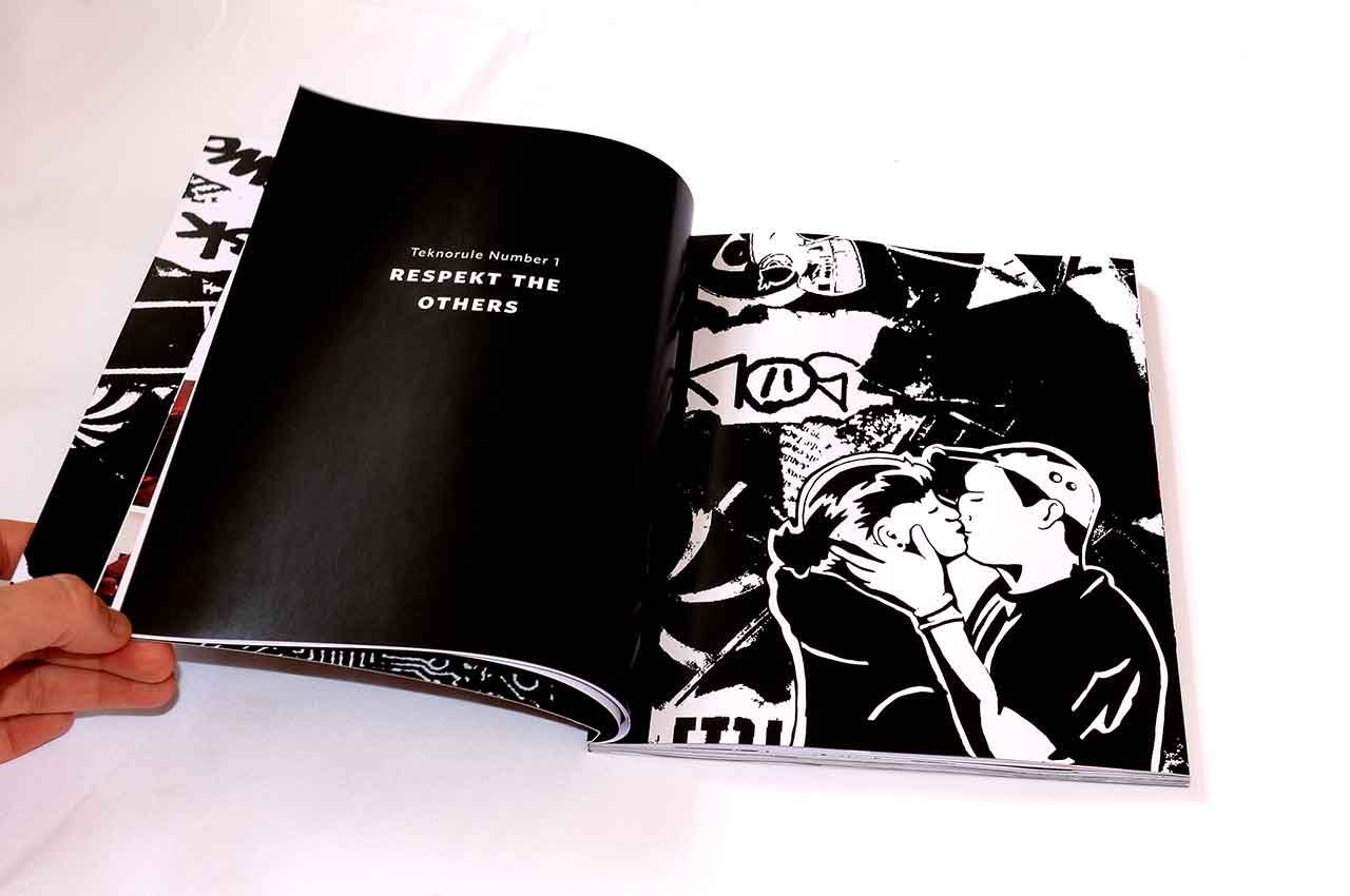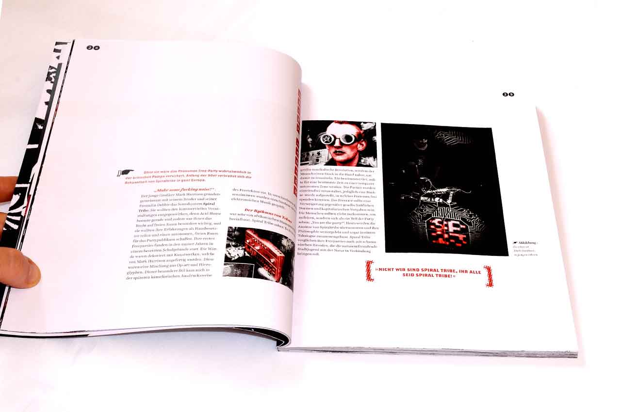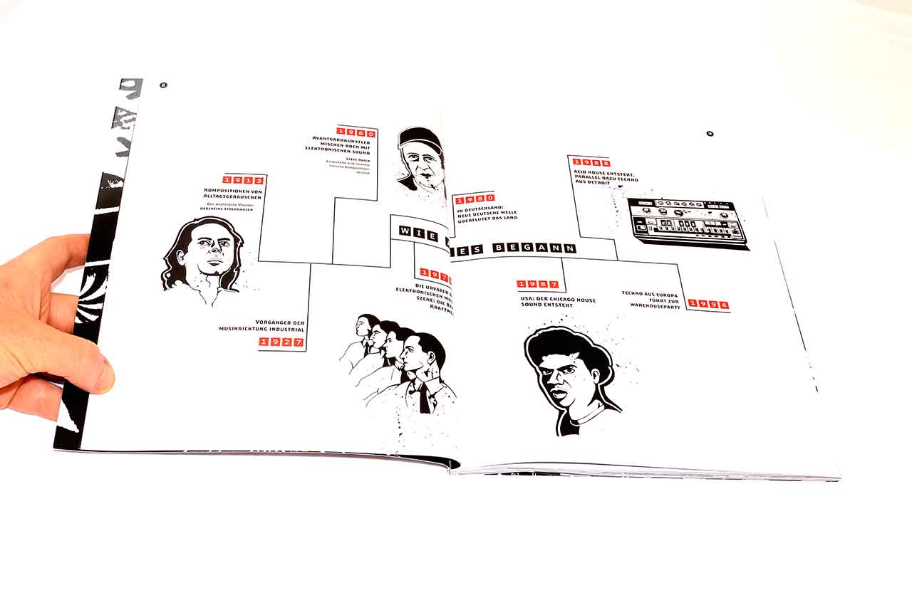 Durch lllustrationen und dem grungigen Look sollte der “Tekno-Stil” beibehalten werden. Möglichst das meiste in schwarz-weiß gehalten, Op-Art oder Spiralen.