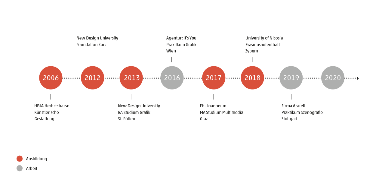 2016 habe ich mein Bachelorstudium im Bereich Grafik Design an der New Design University in St. Pölten und 2019 mein Masterstudium im Bereich Multimedia Design an der Fh Joanneum in Graz abgeschlossen. Ich absolvierte mehrere Praktika in der Kommunikationsagentur IT’S YOU in Wien und in der Szenografie in Stuttgart bei der Firma VISUELL .